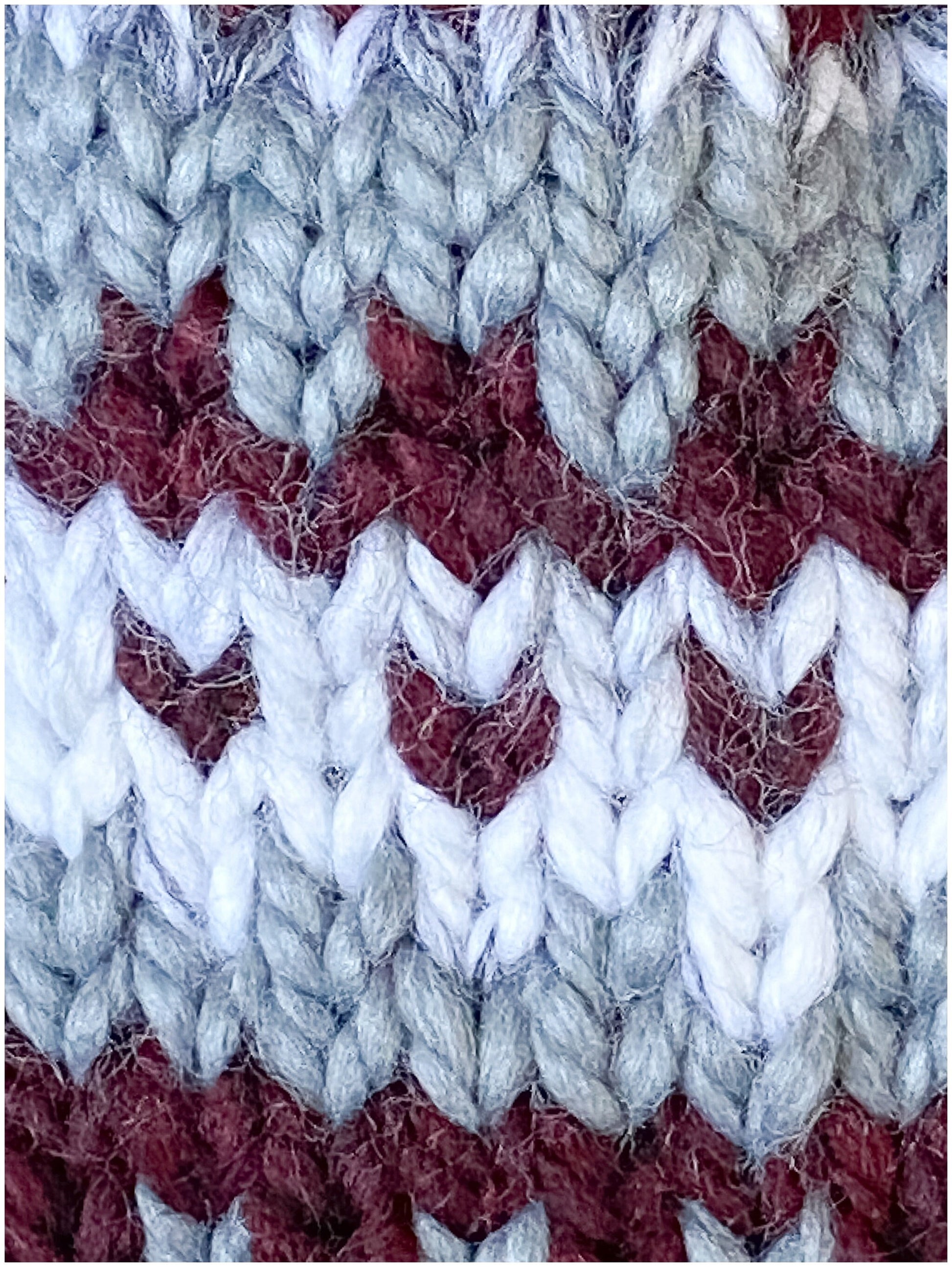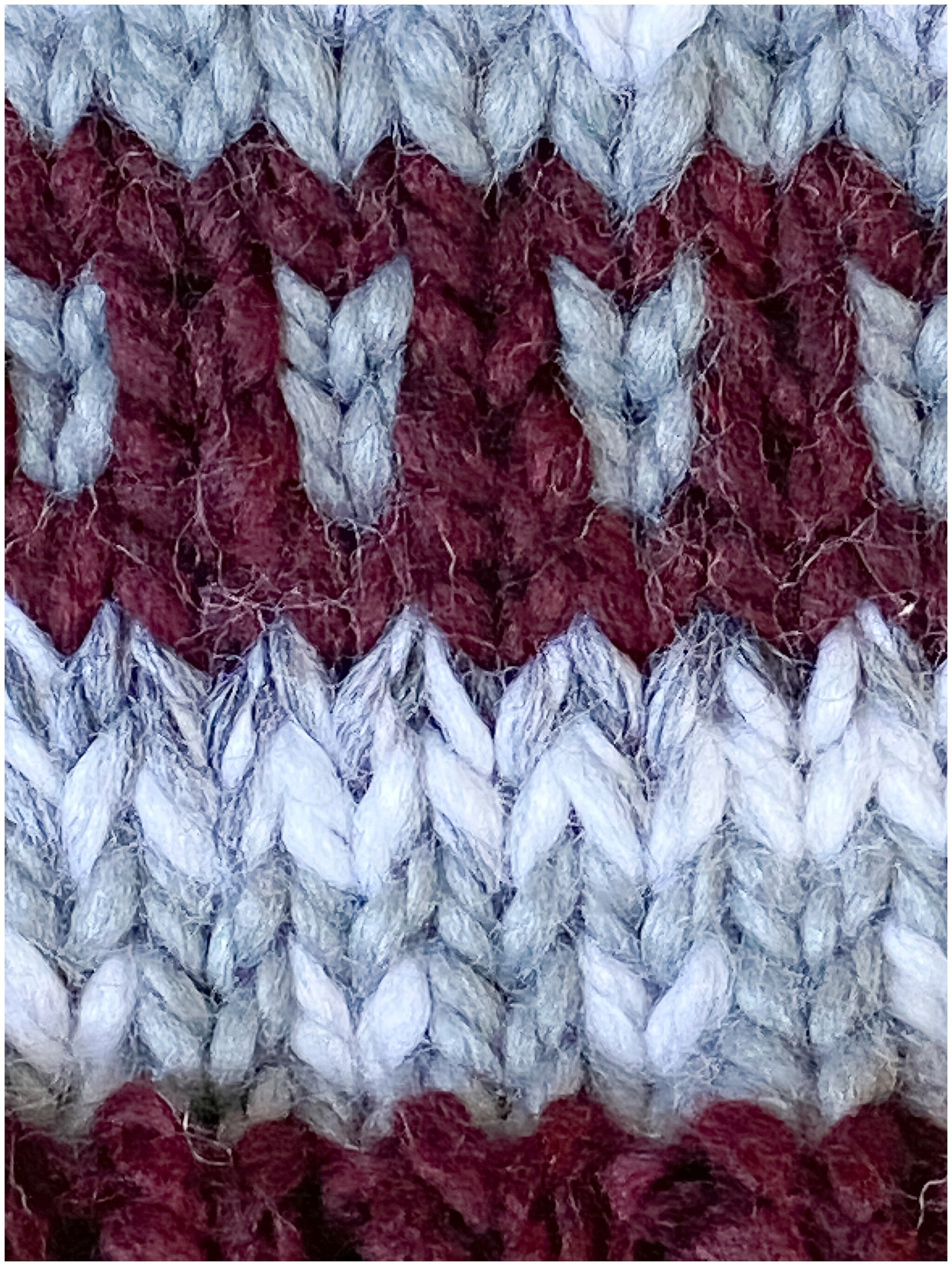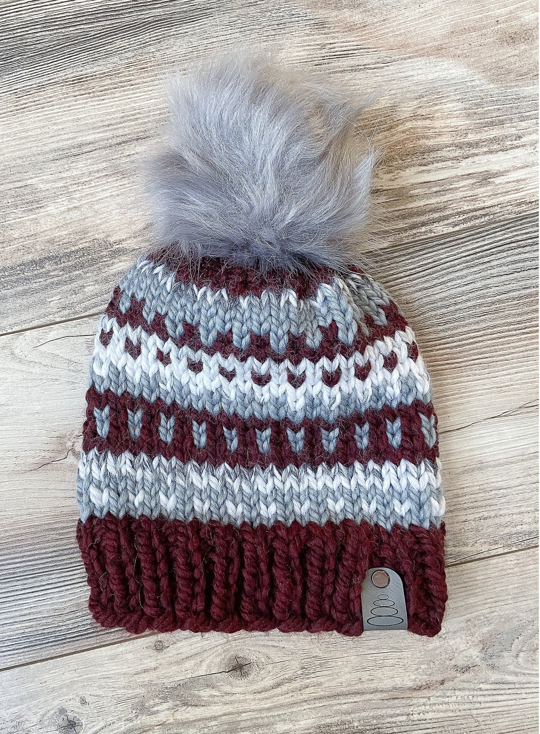 Color: Maroon, marled white patterned yarn, and gray used as an accent color