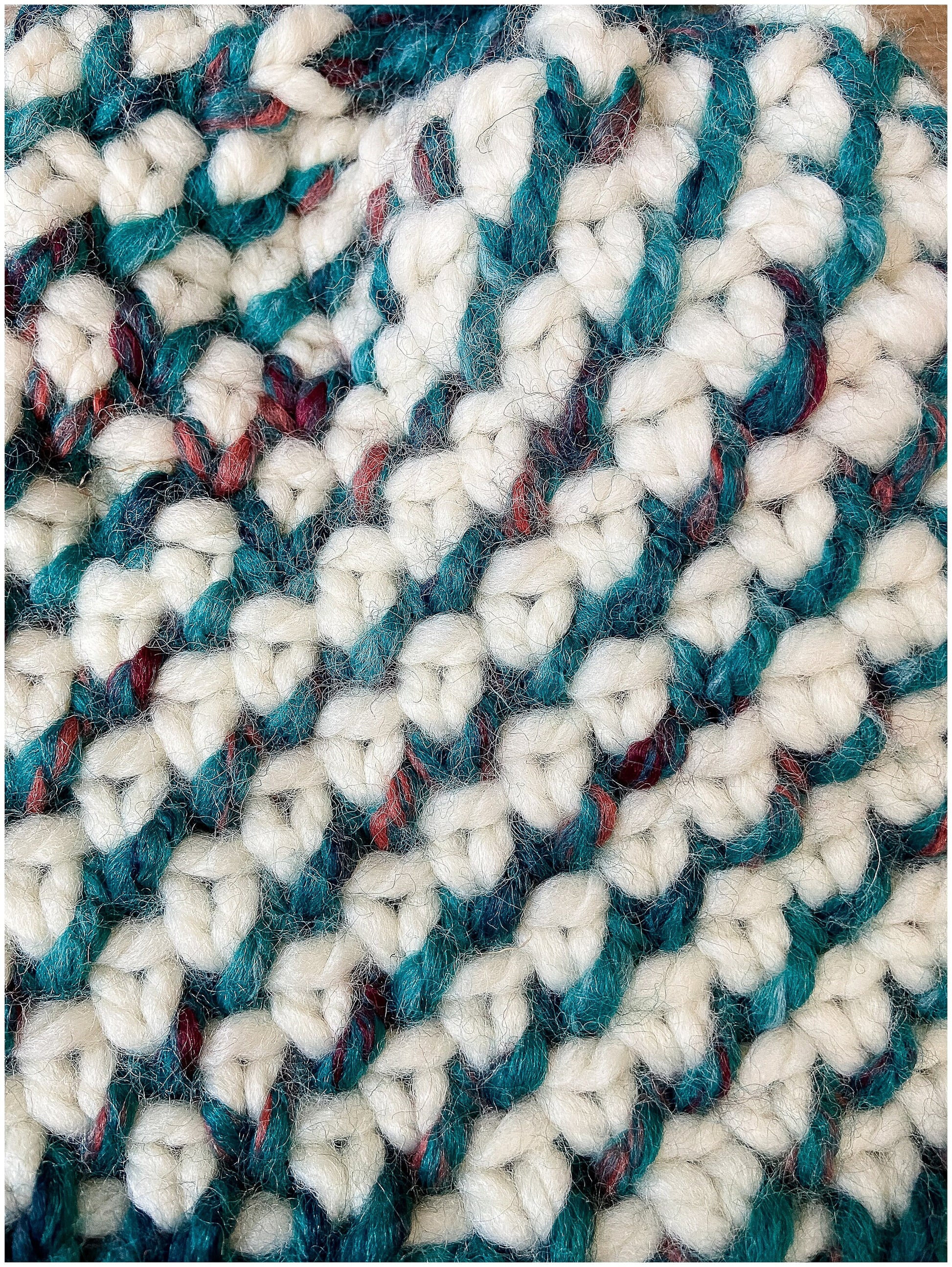 Kaleidoscope hat. Beautiful, cream and variegated teal yarn create a swirl of windows on this hat, creating a kaleidoscope effect. The interesting pattern on this hat creates a beautiful texture.