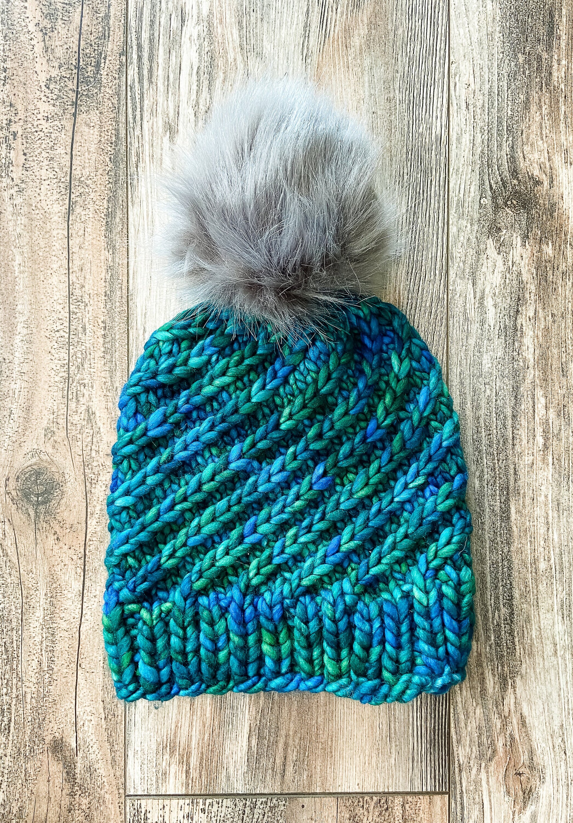 Have you ever craved warmth and luxury wrapped up into one small, snug package? We have the perfect solution for you! A luxury beanie made from 100% merino wool with a removable faux fur pom-pom. This beautiful beanie features a swirl pattern, that is so eye catching. The blue and green yarn only adds to the beauty of this beanie.