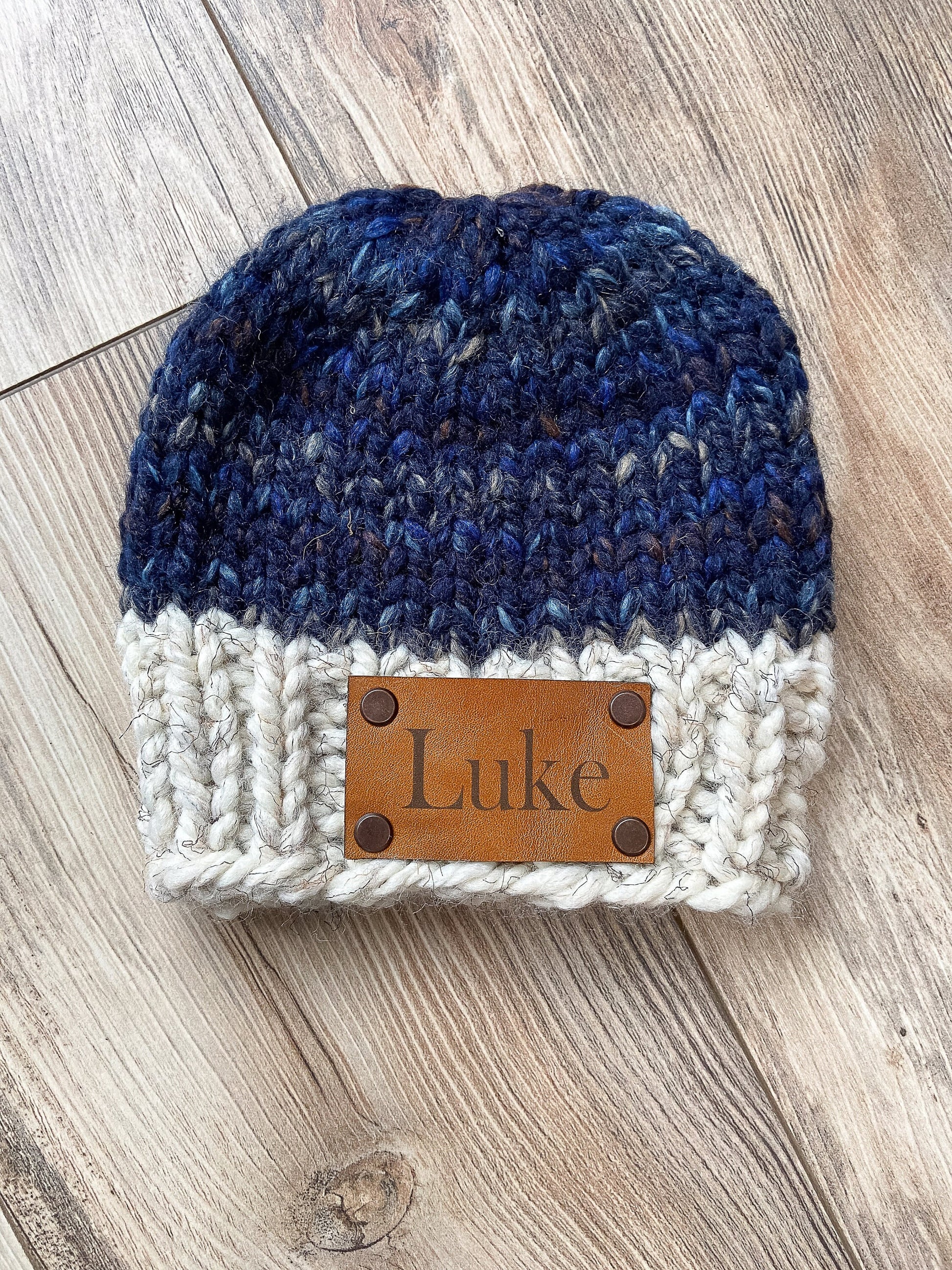 This hat is COMPLETELY made in house! Hand knit by me with personalization tag lasered (usually by my husband) so it is sure to be one of a kind!