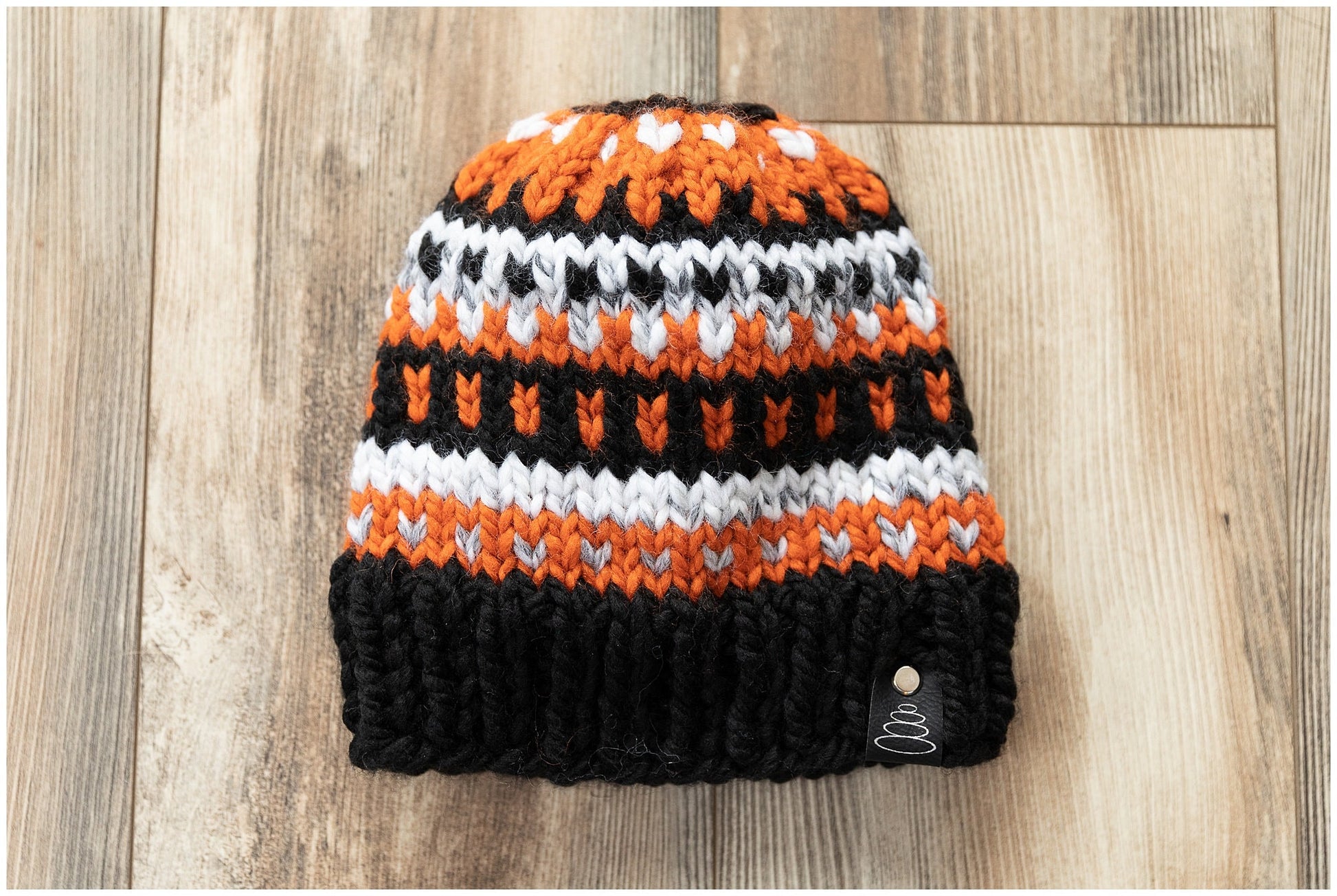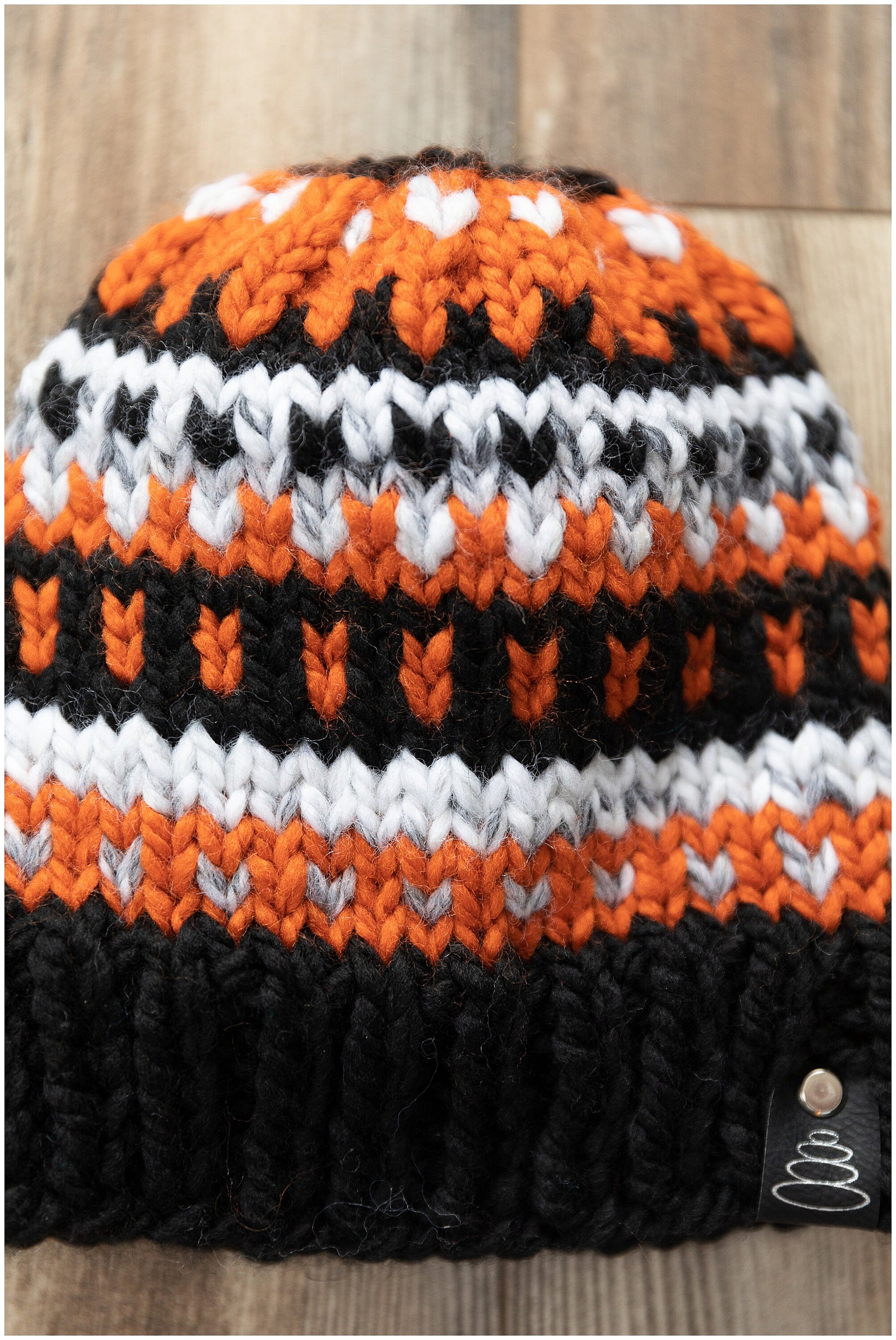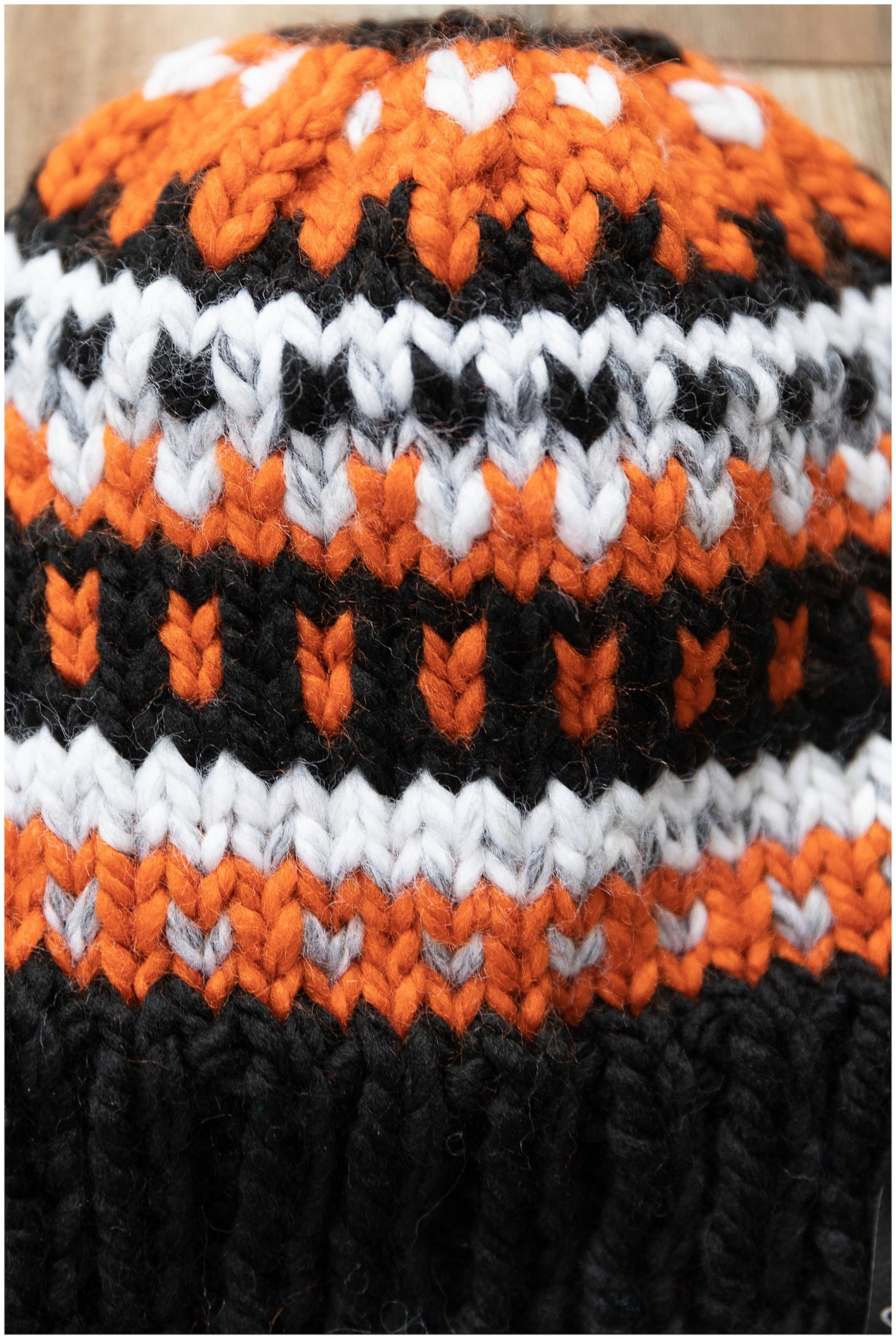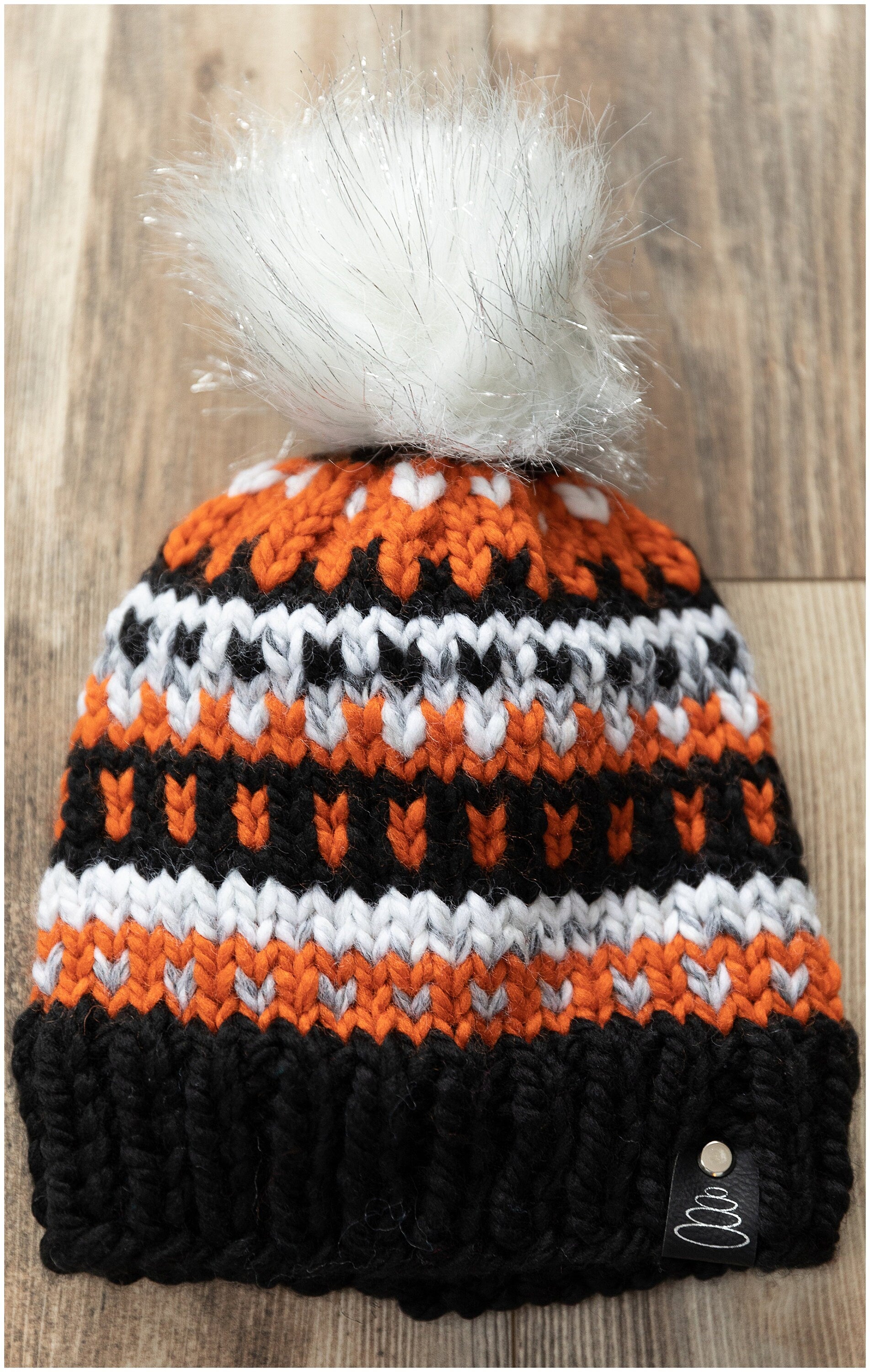 Color: Orange, white & black contrasting colors. Choose your look, order without a pom-pom, or with coordinating yarn or faux fur pom-pom. Black pom-poms available in small & large, white pom-poms available in small solid white and large white with silver strands