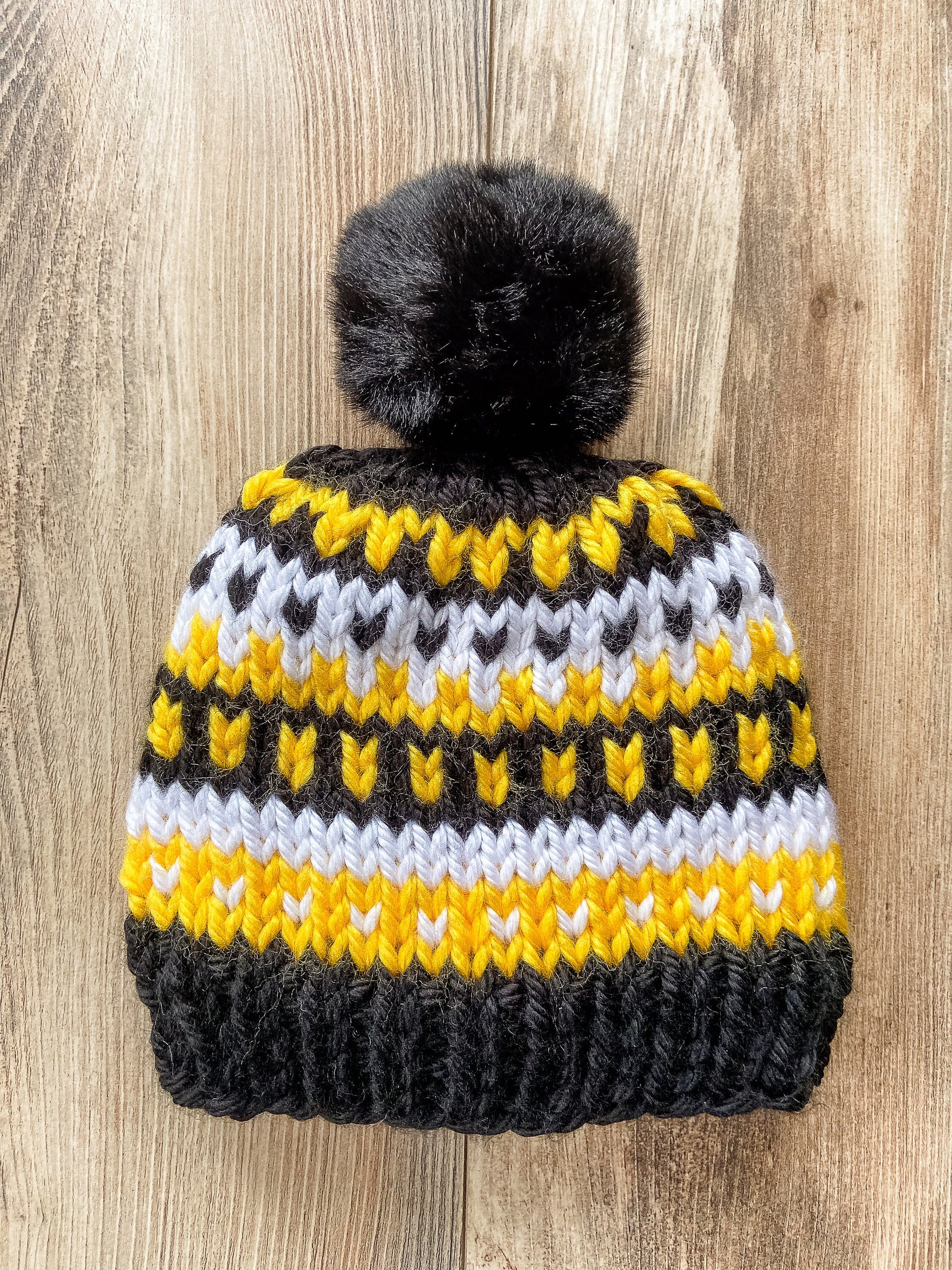 Are you a Steelers fan? This beanie is for you! Pittsburgh Steelers team colors beanie will keep you warm in the stands on game day! Show your team spirt all winter long, running errands about town with this fair isle beanie that features the colors of your favorite NFL team! The classic fair isle pattern can be made in multiple sizes so they whole family head to the stadium in coordinating/matching beanies!