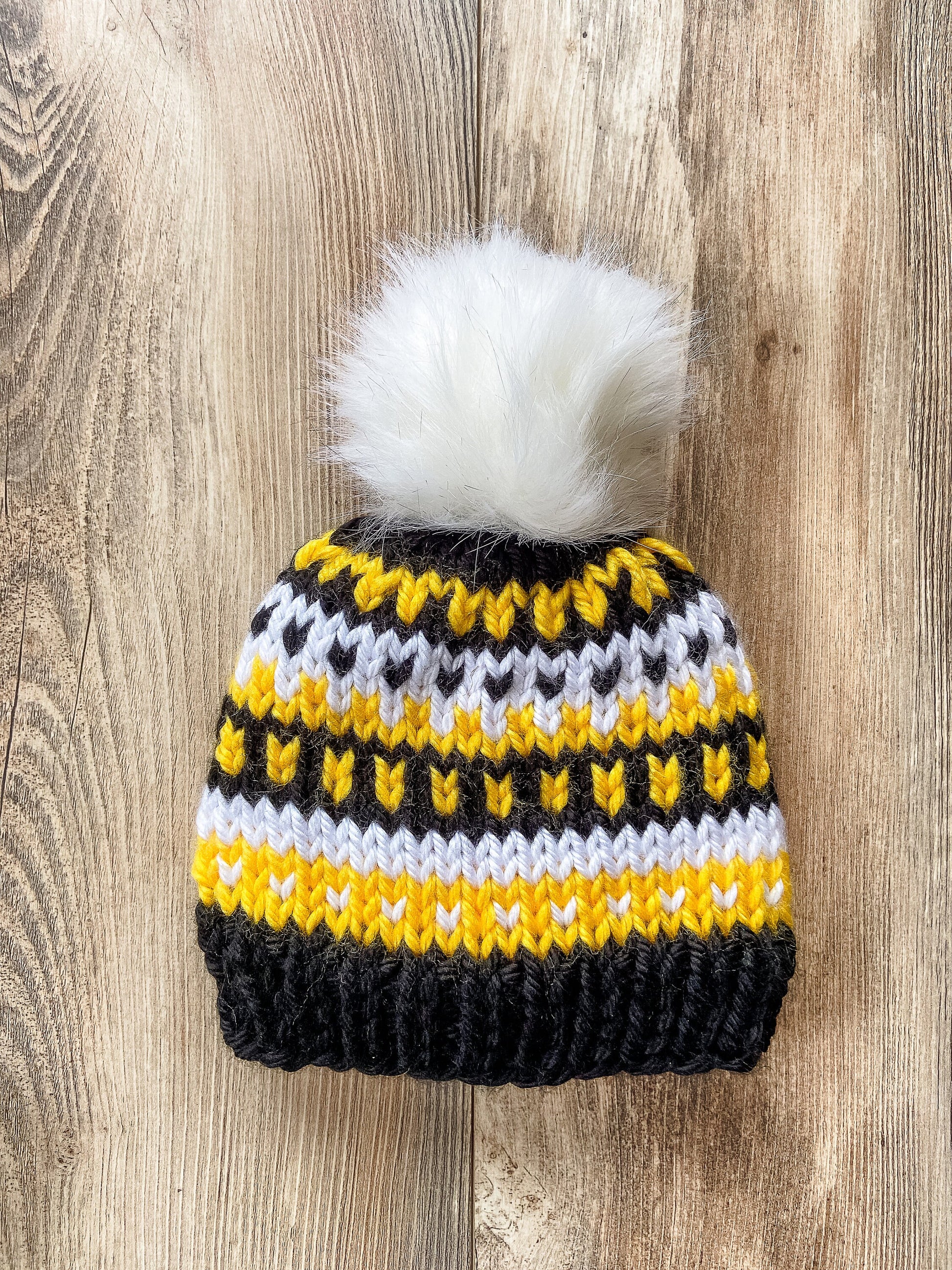 Color: Black, white & yellow contrasting colors. Choose your look, order without a pom-pom, or with coordinating yarn or faux fur pom-pom.