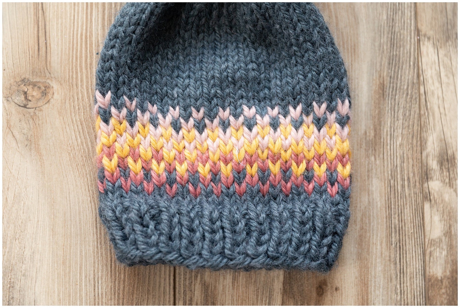 This pattern is beautiful and the colors blend together creating a sunrise/rainbow design. Made of recycled yarn, you can feel good about your purchase and will keep your child cozy all winter long! This hat can be made in any size from newborn to adult (I can accommodate any adult size head with this pattern)
