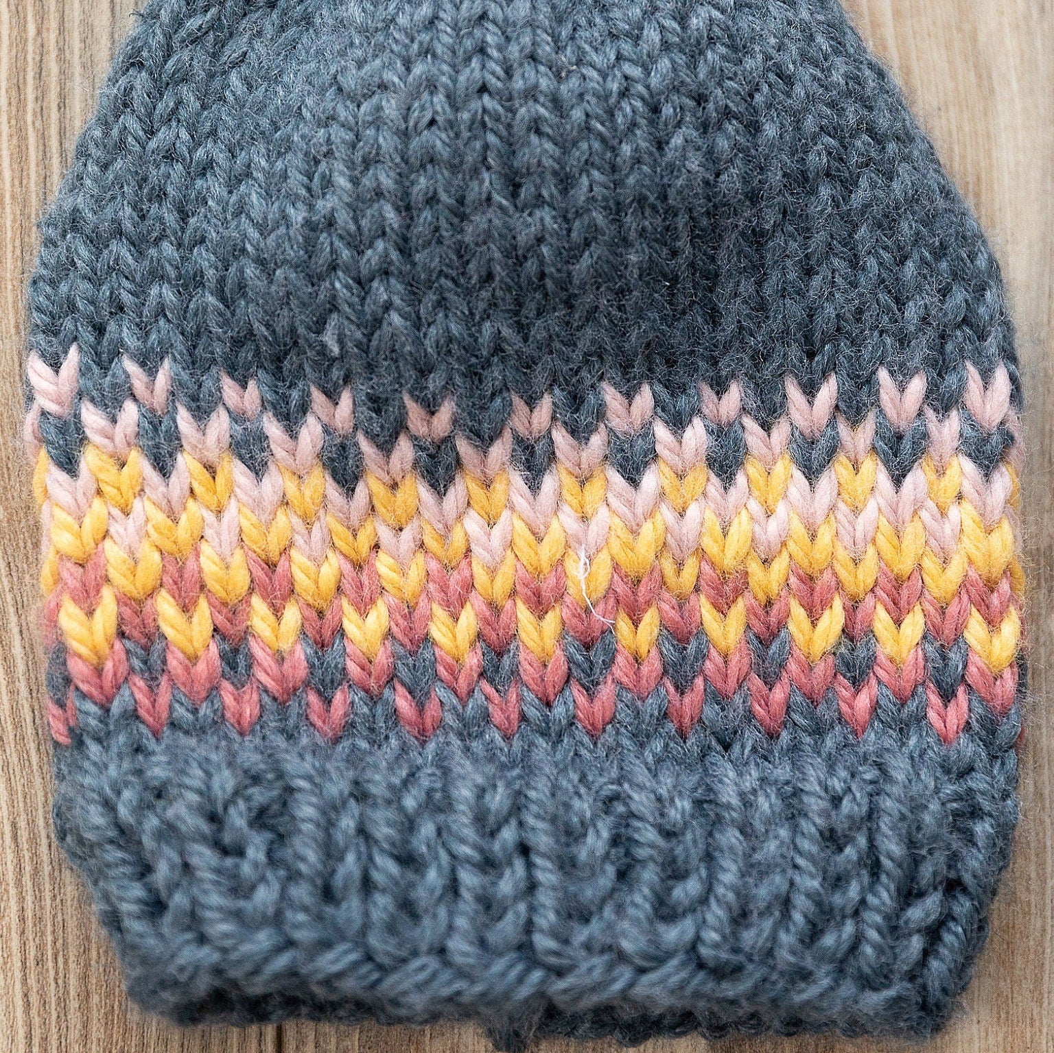 Recycled yarn hat- Fair Isle knit in rainbow/sunrise slouchy style
