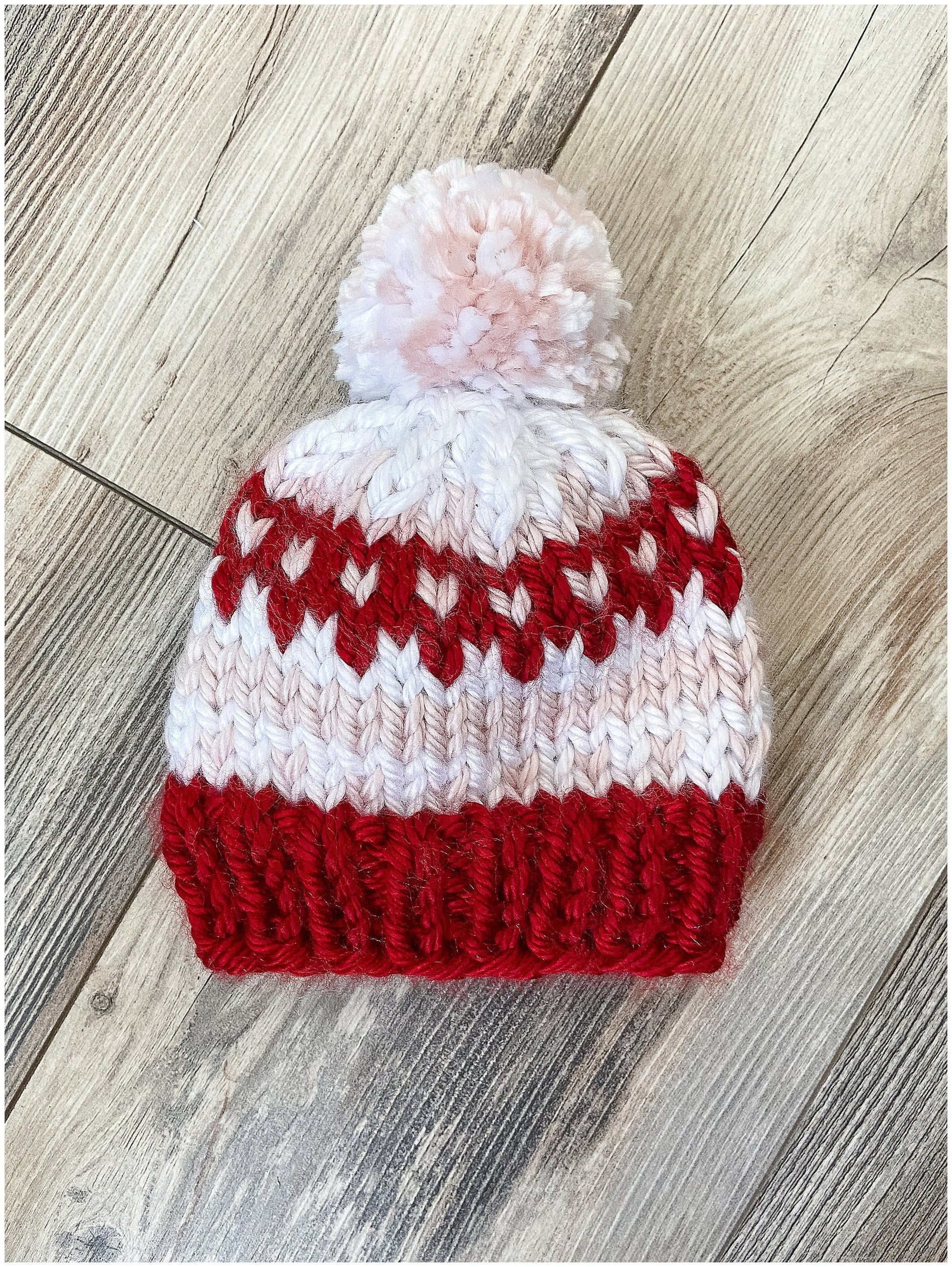 Toddler Fair Isle Christmas hat in Candy Cane colors of red, white and light pink