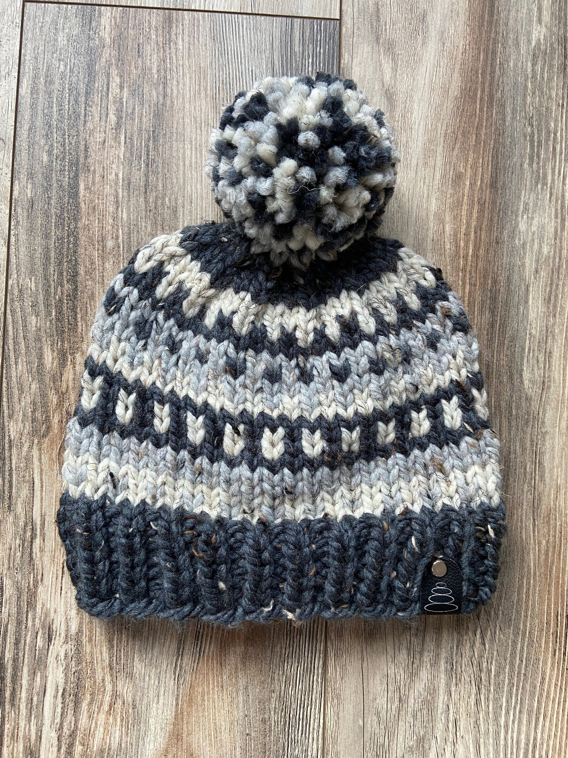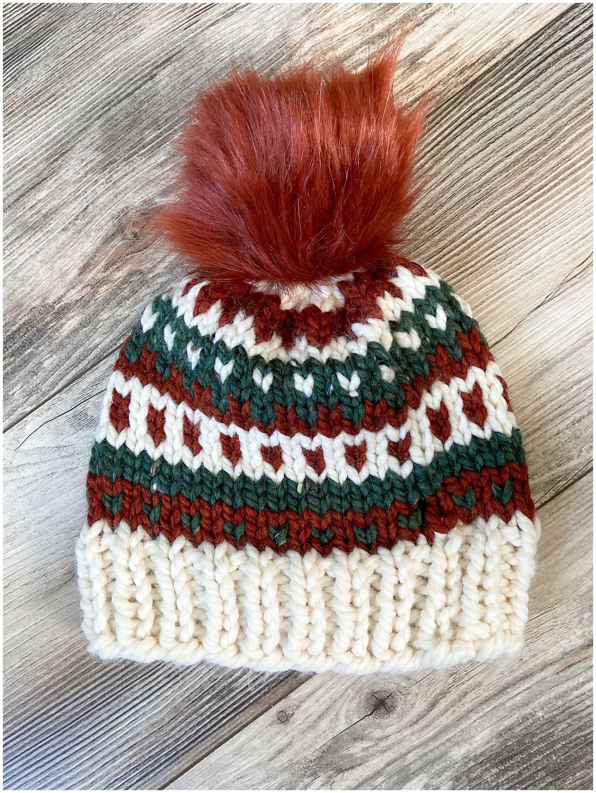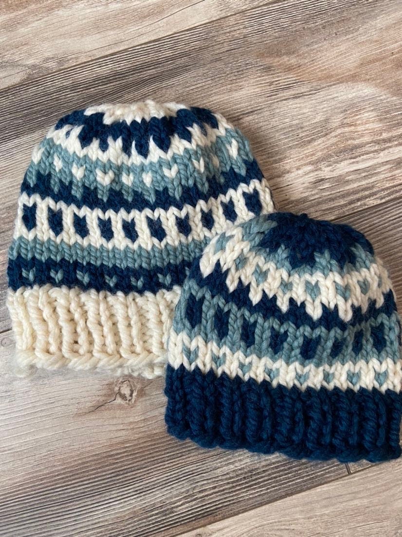Beautiful hand-knit women's beanie is features a fun fair isle pattern. Made with wool blend yarn, this hat will keep you warm throughout the winter! This hat comes in a wide range of sizes perfect for matching with your child, your sweetie or the whole family!